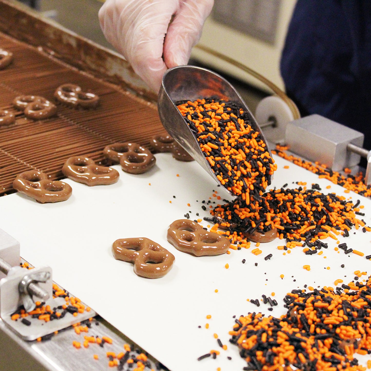 Our sweet and salty combination of pretzels and milk chocolate with the addition of orange and black sprinkles. Perfect for Halloween! (6.8oz)