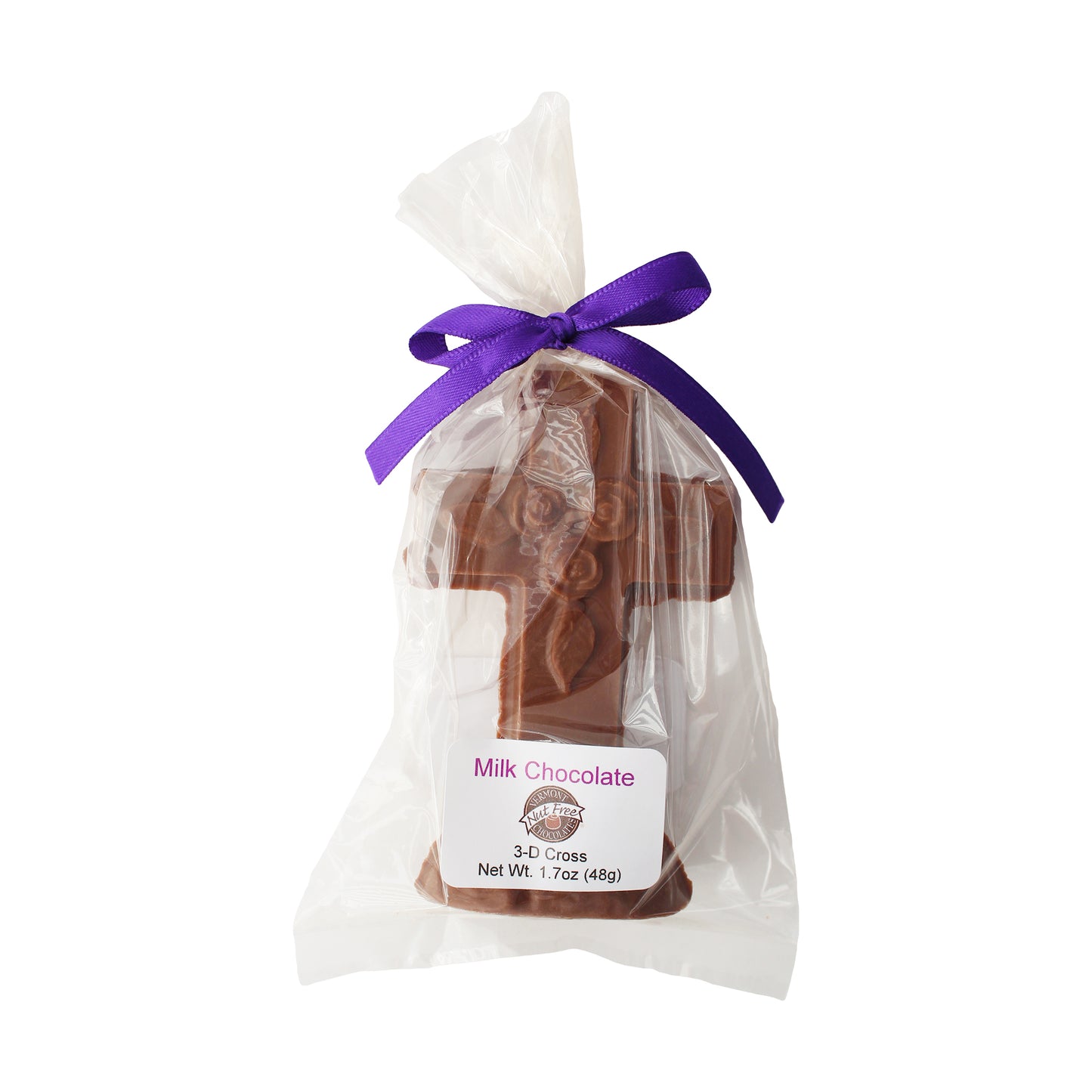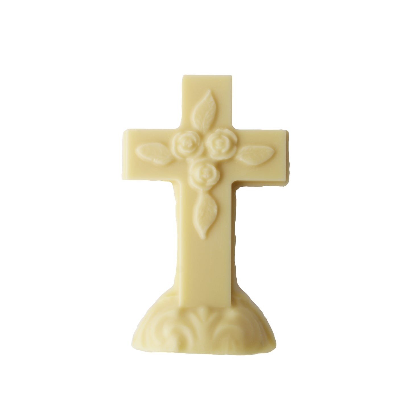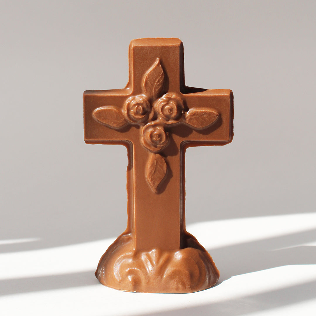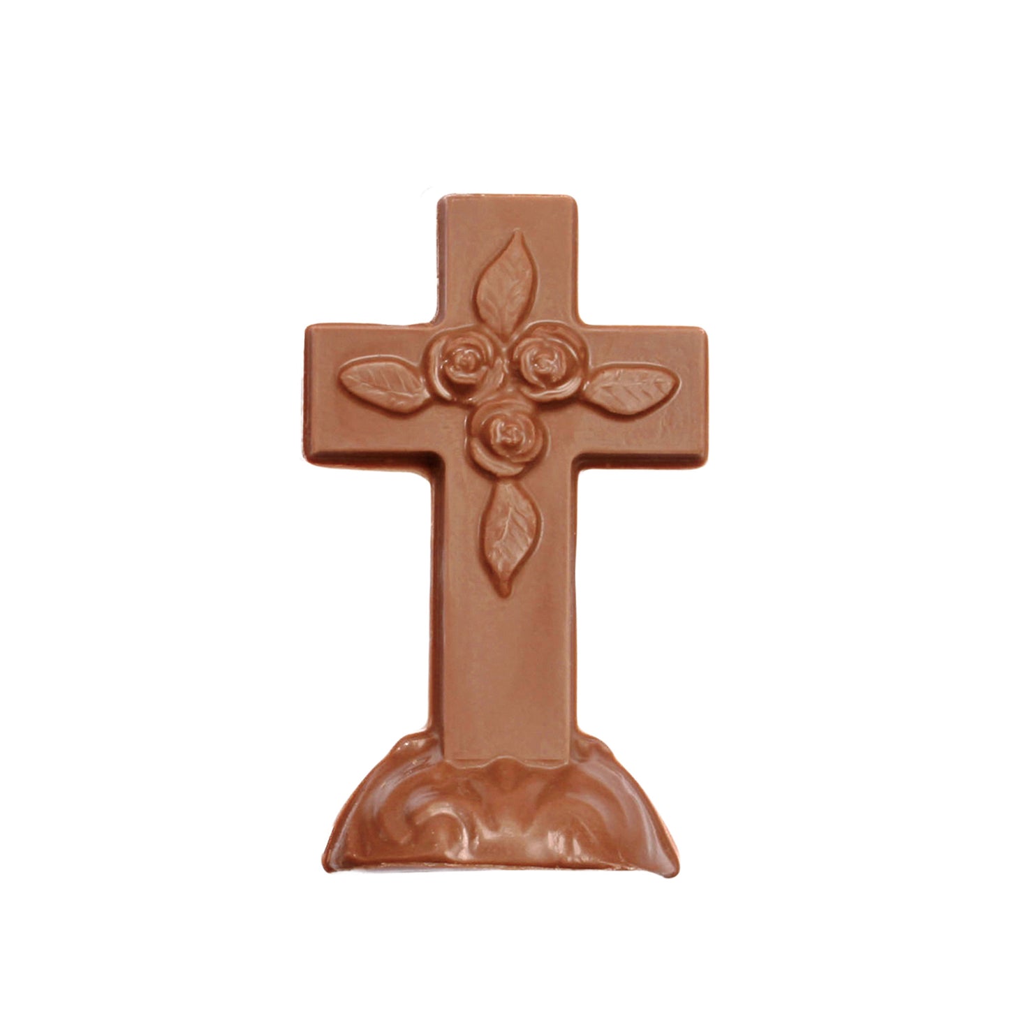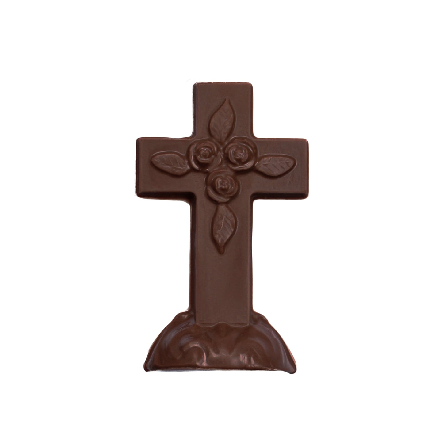 This elegant 3-D chocolate cross features intricate details, including a delicate rose design at its center. Designed to stand freely on its sturdy base, it’s a meaningful and sweet addition to any celebration.