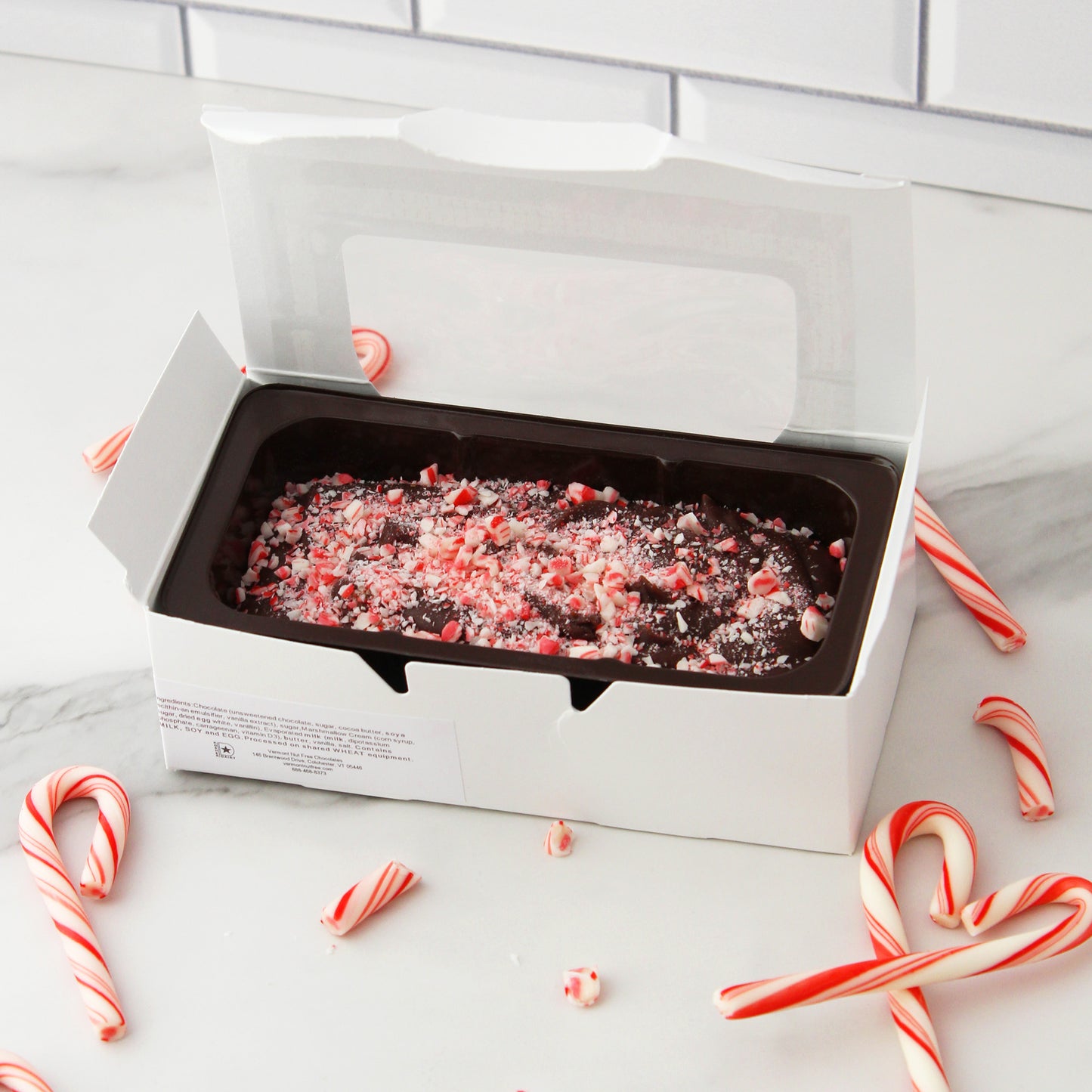 Topped with crushed candy cane pieces for a little sparkle and crunch, it’s a treat that tastes like holiday magic. Presented in a white ribboned box, it’s as beautiful as it is delicious. (8 oz)