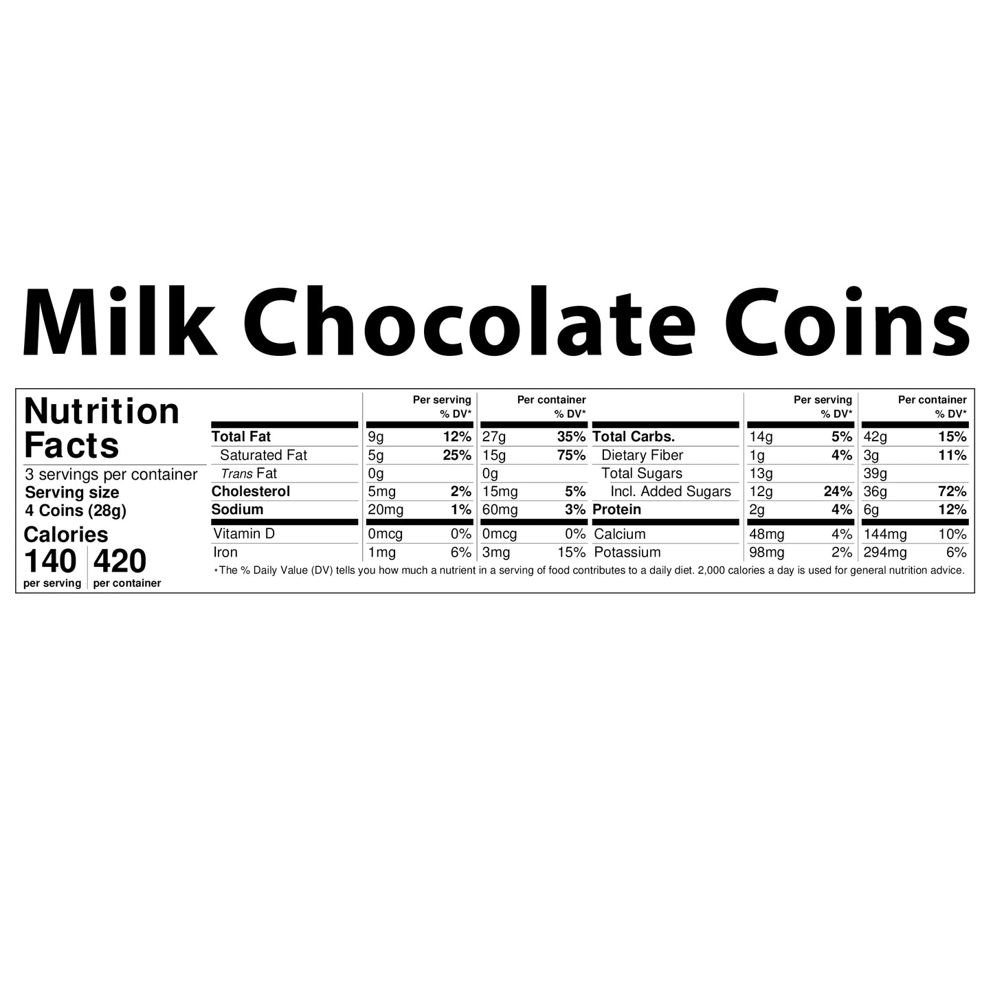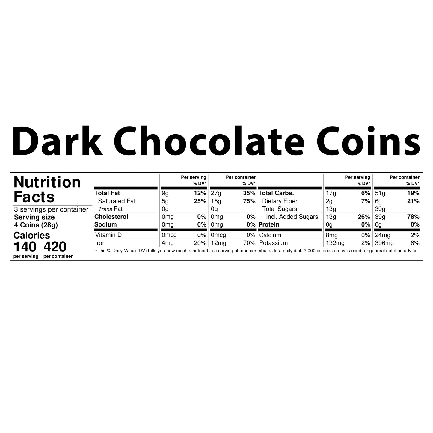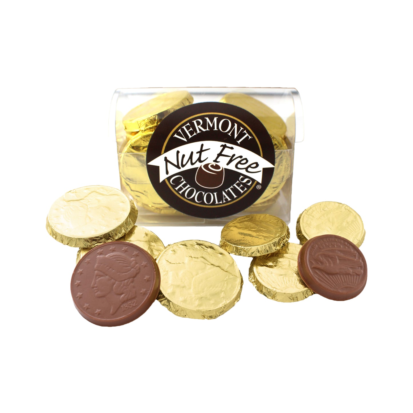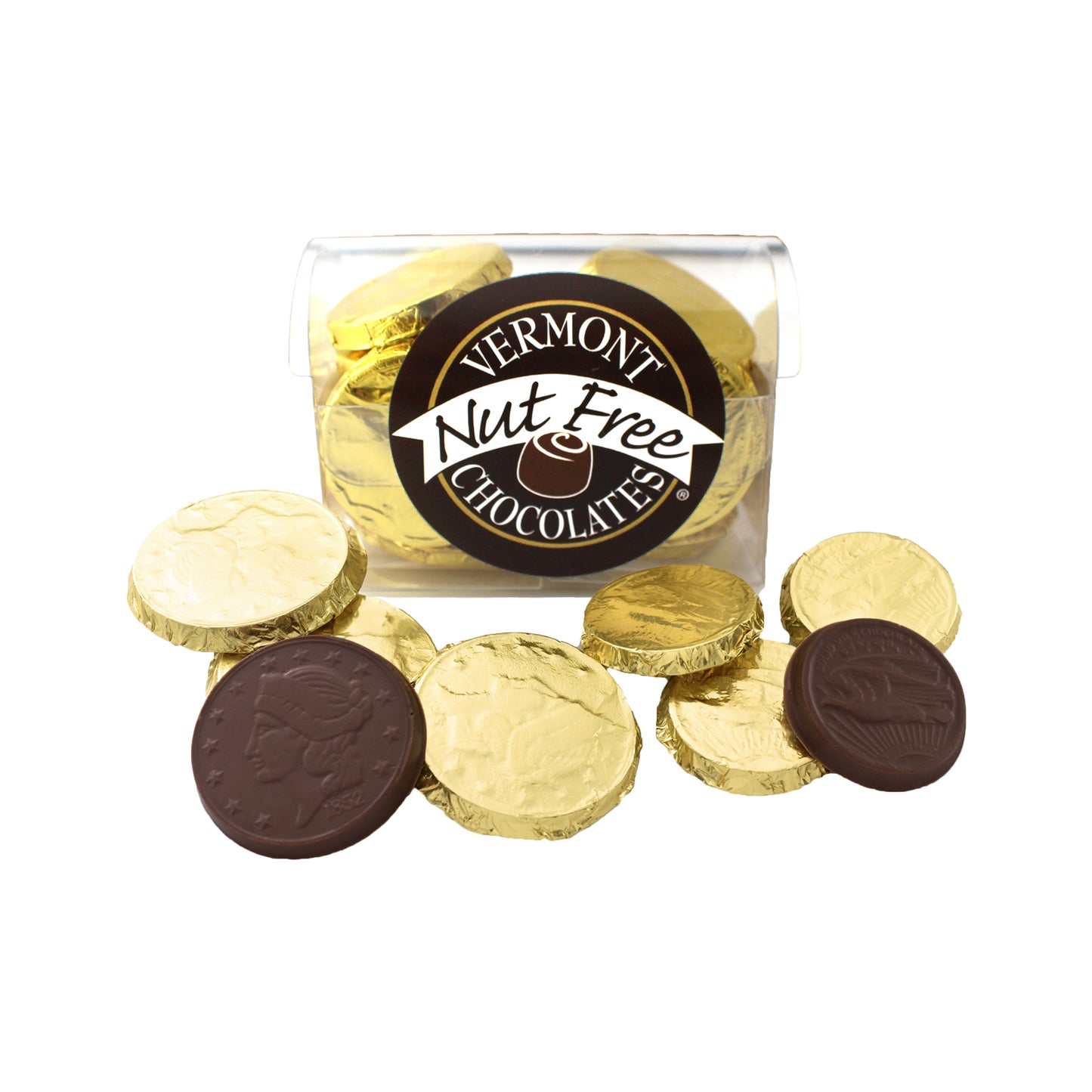 A clear plastic chest of chocolate coins individually wrapped in gold foils. Please note: Small dark chocolate coins are smooth on top with no molded detail imprint. Available in milk or dark chocolate. 12-Pieces per box (3 oz.)