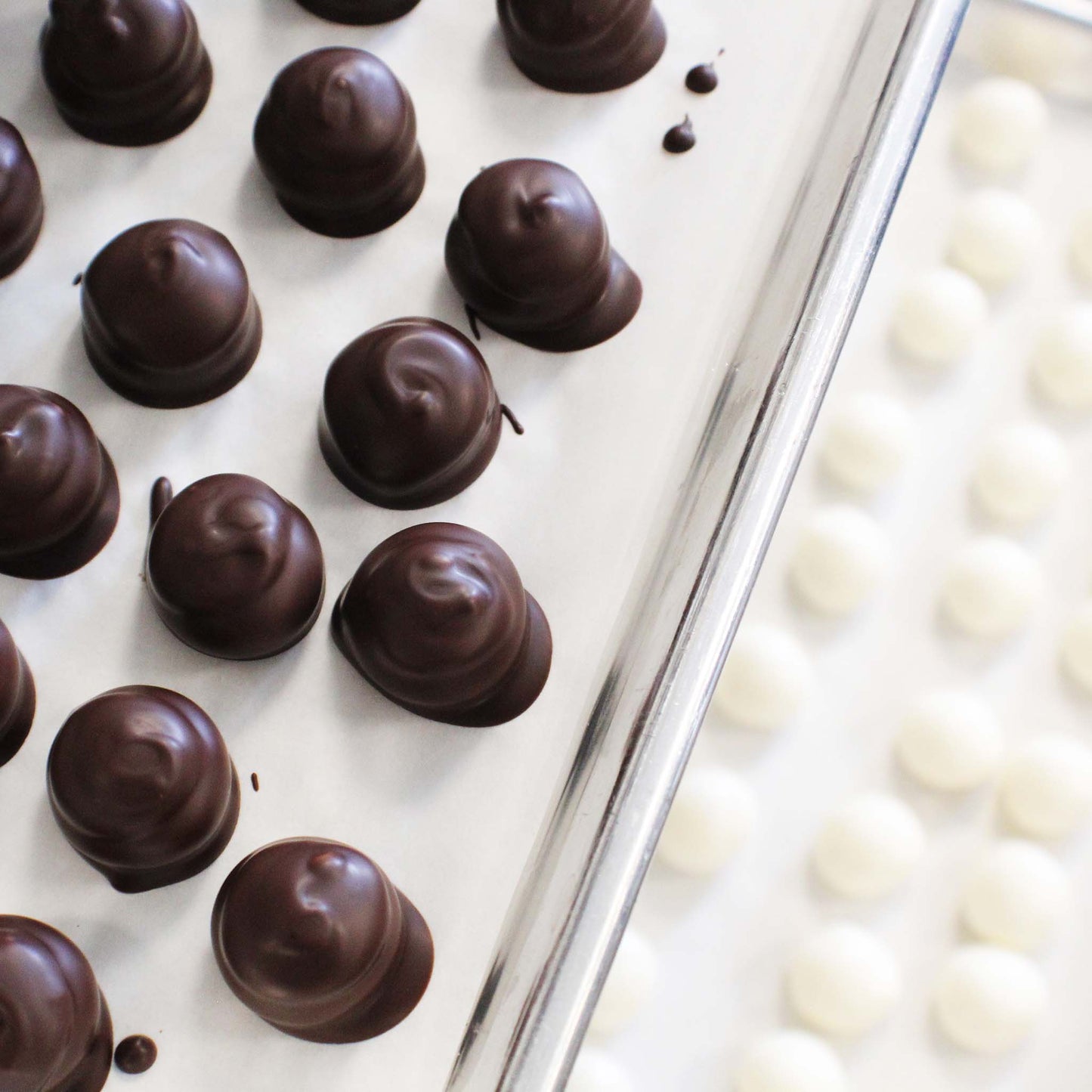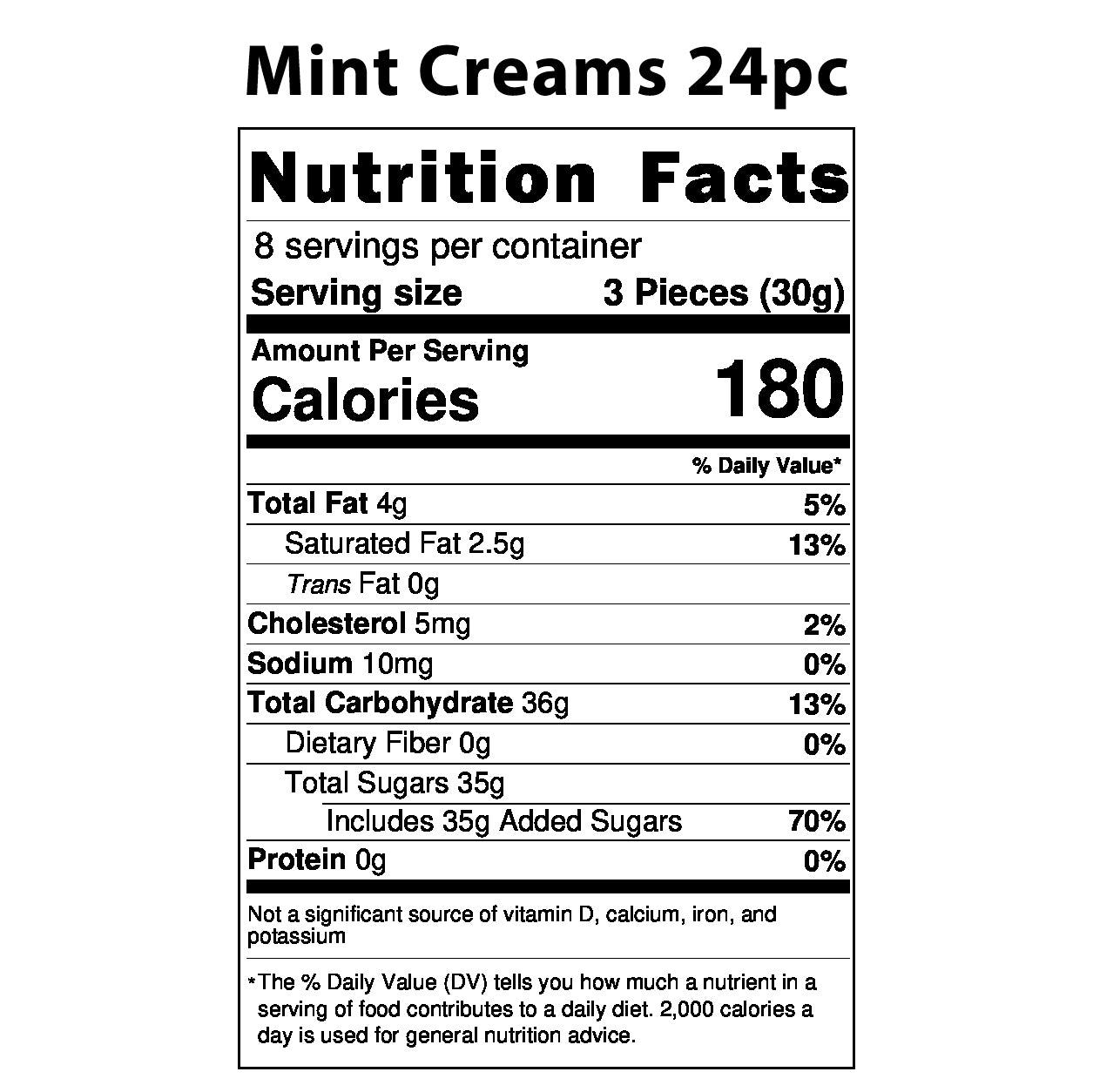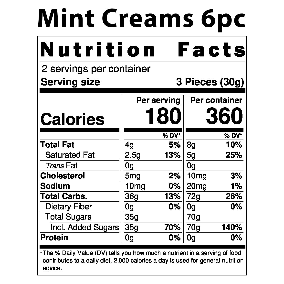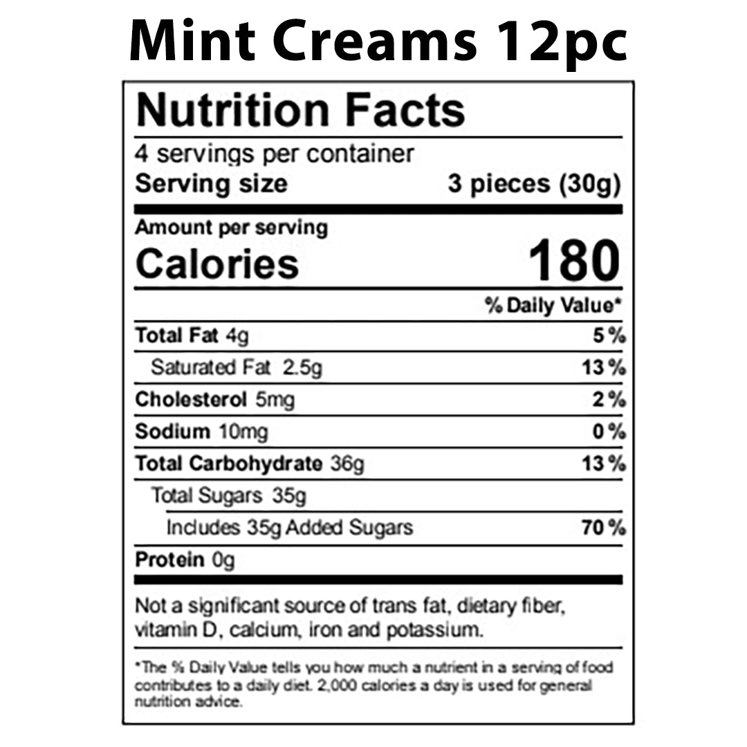 A box of soothingly cool and creamy peppermint centers enrobed in dark chocolate. Available in a 6 piece box, 12 piece box, or 24 piece box.